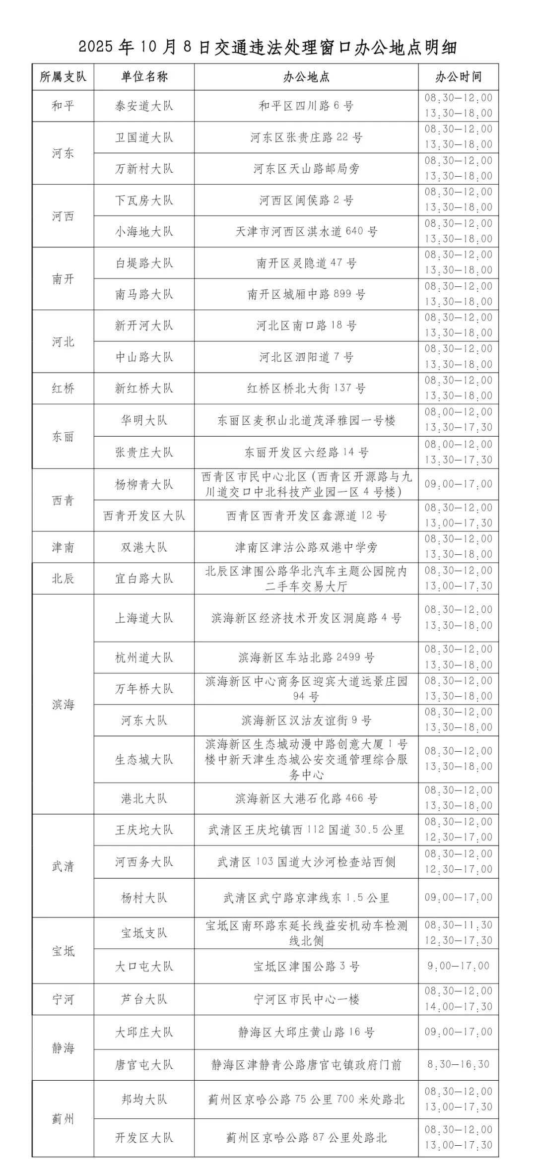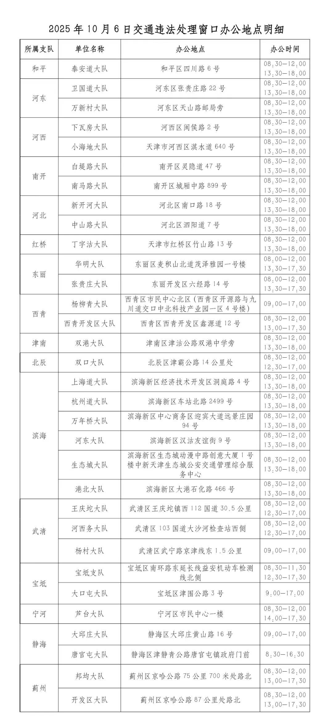 此外,我市违法处理窗口开放情况如下,广大机动车驾驶人可根据自身实际需求前往办理非现场违法处理业务。