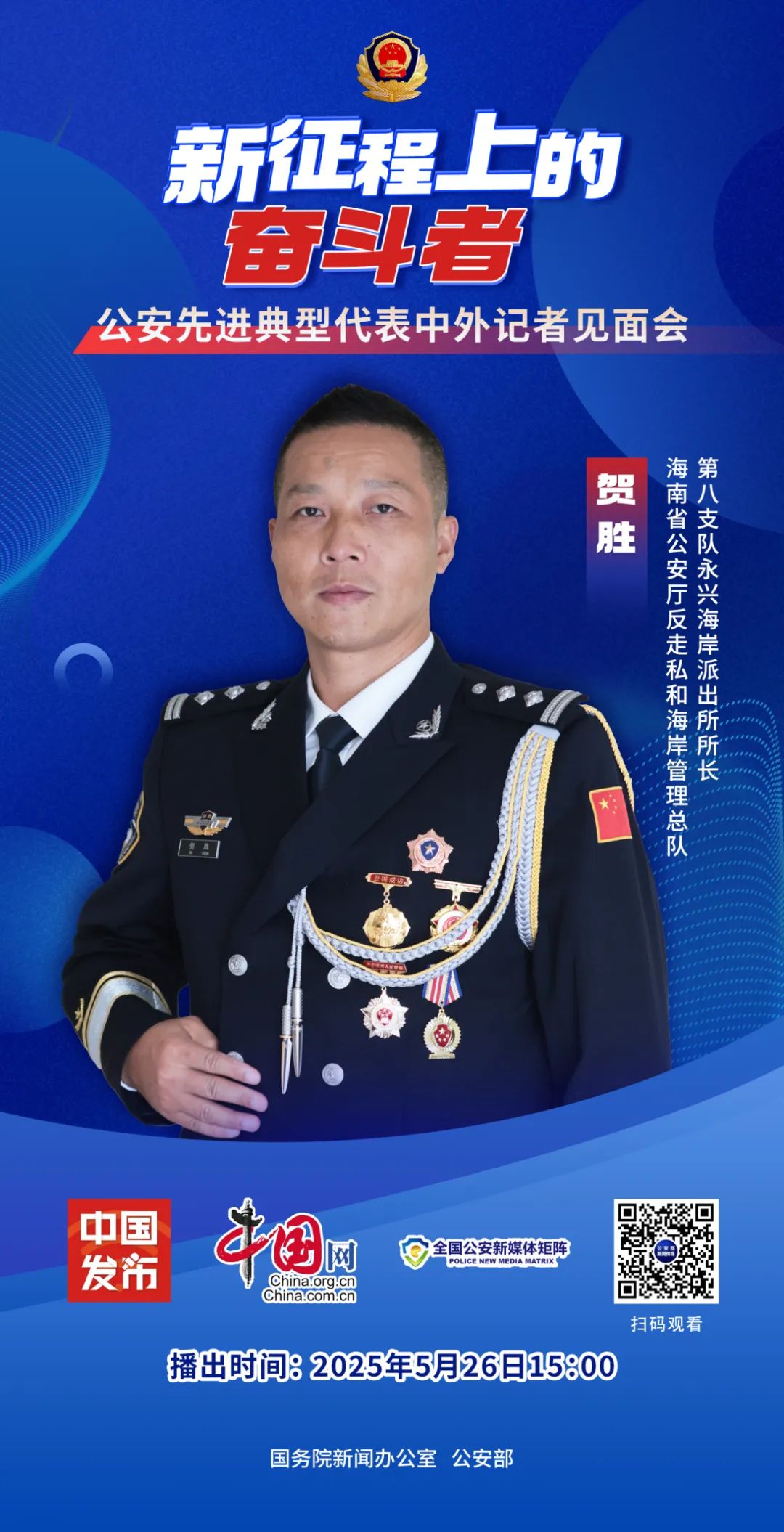 贺胜,男,汉族,1984年2月出生,中共党员,现任海南省公安厅反走私和海岸管理总队第八支队永兴海岸派出所所长。