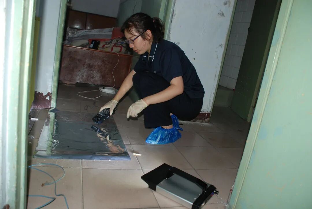 一次,矿区一间办公室发生盗窃案,室内抽屉和柜子被撬开,笔记本电脑、照相机以及数千元现金不翼而飞,现场一片狼藉,各种文件散落一地,勘查难度较大。但地面上几处水迹立刻被细心的蒋丹丹注意到,事出反常,她顺着水迹来到室内饮水机处,发现水槽是满的,且周围地上洒得到处都是水。