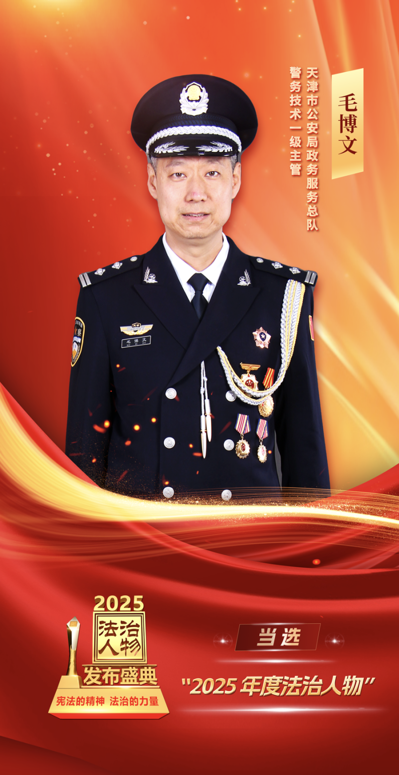 《宪法的精神 法治的力量——2025年度法治人物》专题节目4日晚在中央广播电视总台播出,10位“2025年度法治人物”和4位“致敬英雄”获奖者揭晓。其中,天津市公安局政务服务总队警务技术一级主管毛博文当选“2025年度法治人物”,湖北省武汉市公安局江夏区分局交通管理大队原二级警长蒋仲超、宁夏回族自治区银川市公安局监所管理支队原三级高级警长杨春华荣获“致敬英雄”。