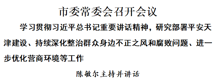 3月17日,市委常委会召开会议,学习贯彻习近平总书记在中央政治局第十九次集体学习时的重要讲话精神,部署持续深化整治群众身边不正之风和腐败问题有关工作,研究天津市进一步优化营商环境的政策措施。市委书记陈敏尔主持会议并讲话。