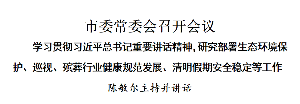 4月2日,市委常委会召开会议,学习贯彻3月31日中央政治局会议精神和习近平总书记在会见国际工商界代表时的重要讲话精神,听取我市推进中央巡视反馈意见整改、中央生态环境保护督察反馈问题整改、十二届市委巡视工作和整治殡葬领域腐败乱象专项行动等情况汇报,部署清明假期安全稳定等工作。市委书记陈敏尔主持会议并讲话。
