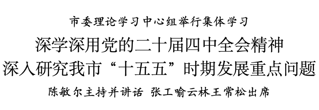 陈敏尔在讲话中指出,学习好贯彻好党的二十届四中全会精神,是当前和今后一个时期的一项重大政治任务。要从深刻领悟“两个确立”的决定性意义、坚决做到“两个维护”的高度,全面准确领会习近平总书记在全会上的重要讲话和《中共中央关于制定国民经济和社会发展第十五个五年规划的建议》精神,系统深入学,融会贯通学,不断加深对全会精神的理解,自觉贯彻落实到“十五五”时期我市经济社会发展各方面全过程。把学习贯彻全会精神同学习贯彻习近平新时代中国特色社会主义思想贯通起来,把握好这一重要思想的世界观和方法论,坚持好、运用好贯穿其中的立场观点方法。把学习贯彻全会精神同深入落实习近平总书记视察天津重要讲话精神和对天津工作一系列重要指示要求结合起来,牢牢把握以推进京津冀协同发展为战略牵引、“四个善作善成”等重要要求,全面建设社会主义现代化大都市。把学习贯彻全会精神同做好实际工作联系起来,内化于心、外化于行,突出问题导向、实践导向、需求导向,用情讲、用力做,具体抓、抓具体,将全会部署融入到岗位职责、体现在工作效果上。