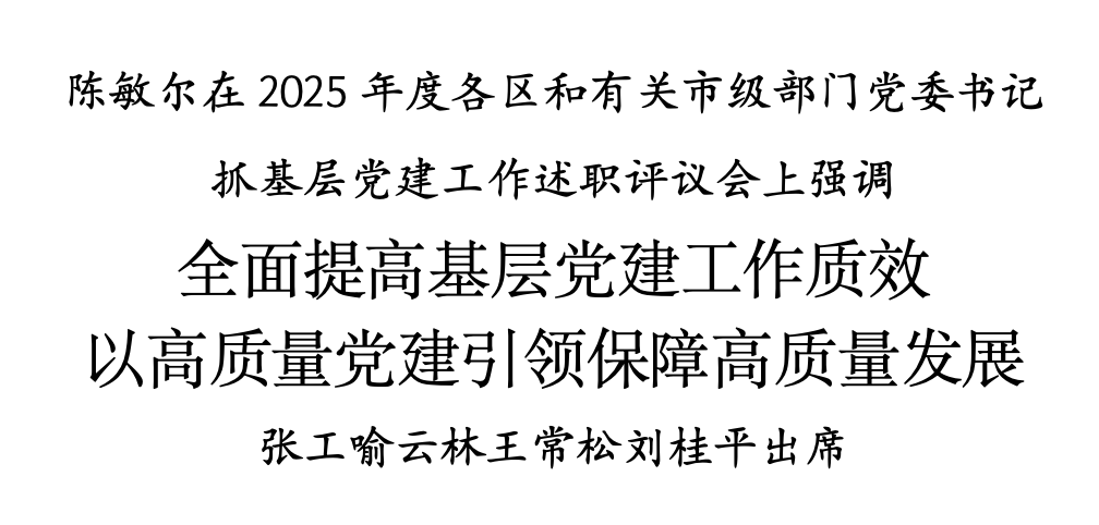 陈敏尔指出,这次述职评议在我市“十四五”收官、“十五五”开局之时,在深入推进中央巡视反馈意见整改之际进行,是对全市基层党建工作的实际检验,是推动巡视整改落实的具体行动,也是对“十五五”开好局、起好步的有力促进。一年来,全市各级党组织牢记习近平总书记殷殷嘱托、谆谆教诲,扎实开展深入贯彻中央八项规定精神学习教育,推动党的建设各项工作取得新进展新成效。同时也要清醒看到,工作中还存在一些差距和不足。要坚持问题导向,把自己摆进去,深入检视思考对党建工作重视程度够不够、管党治党责任落实到不到位、党的政治建设抓得紧不紧、正确政绩观树得牢不牢、担当精神斗争精神强不强、基层党组织政治功能和组织功能发挥得好不好、对本区本部门政治生态分析研判准不准,从客观上找差距,从主观上找原因,采取有力措施,认真改进提升。