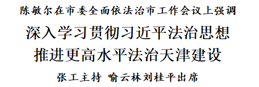 陈敏尔强调,要加强党的领导,为全面依法治市提供坚强政治保证。全市各级党委(党组)要担负主体责任,将法治建设和经济社会发展同谋划、同部署、同推进,各区各部门要担负起政治责任、工作责任,齐抓共管、协同配合,进一步拧紧法治建设责任链条,凝聚起推进法治天津建设的强大合力。加强法治专门队伍革命化、正规化、专业化、职业化建设,引导法律服务工作者坚持正确政治方向,依法依规诚信执业,认真履行社会责任。各级领导干部要发挥“关键少数”示范引领作用,带头加强党内法规和国家法律法规学习,不断提高运用法治思维和法治方式深化改革、推动发展、化解矛盾、维护稳定、应对风险的能力。