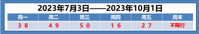 2023年7月3日起,天津新一轮尾号限行即将开始。自2023年7月3日至2023年10月1日,星期一至星期五限行机动车号牌尾号(机动车号牌尾号为英文字母的按0号管理)分别为3和8、4和9、5和0、1和6、2和7。