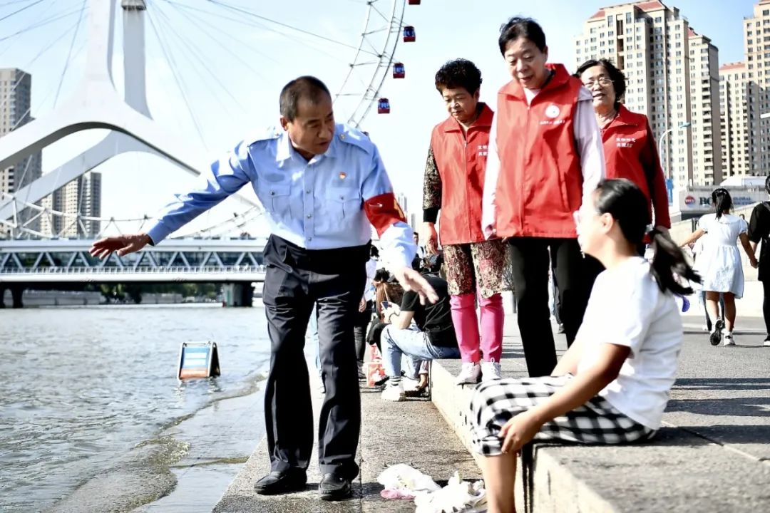 每当清晨的第一缕阳光洒下,“穆baibai”早已经整装待发,迈着坚定的步伐,开始一天的巡逻。“今年我被聘请为鸿顺里街道民间河湖长,所以上午趁游客不多,我主要是把海河边的垃圾清理下,同时提醒大家不要乱扔垃圾,共同维护好海河水域的环境。”