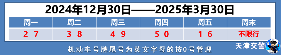 2024年12月30日至2025年3月30日,星期一至星期五限行机动车号牌尾号分别为2和7、3和8、4和9、5和0、1和6(机动车号牌尾号为英文字母的按0号管理)。