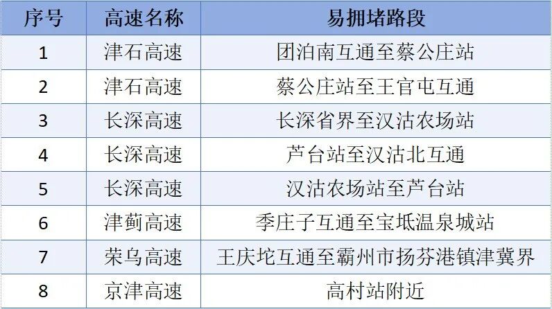 预计流量较大的高速公路主要有津石、长深、京沪、津蓟、京津高速等路段。