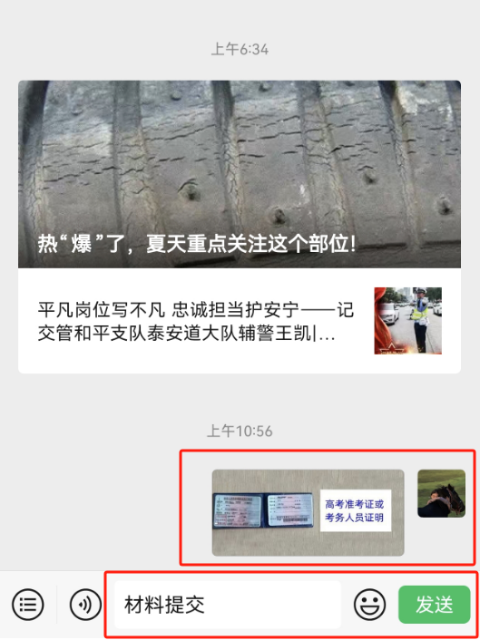 6月7日考试前,考生家长将考生高考准考证与接送考生小客车行驶证同框照片,考务人员将所在单位出具的证明材料与驾乘小客车行驶证同框照片,通过个人微信向“天津交警”微信公众号发送,并发送文字“材料提交”。公安交管部门将对备案车辆违反相关限行规定不予处罚;对于路面被执勤交警拦检的限号涉考车辆,在核查相关高考证件后,将及时予以放行。