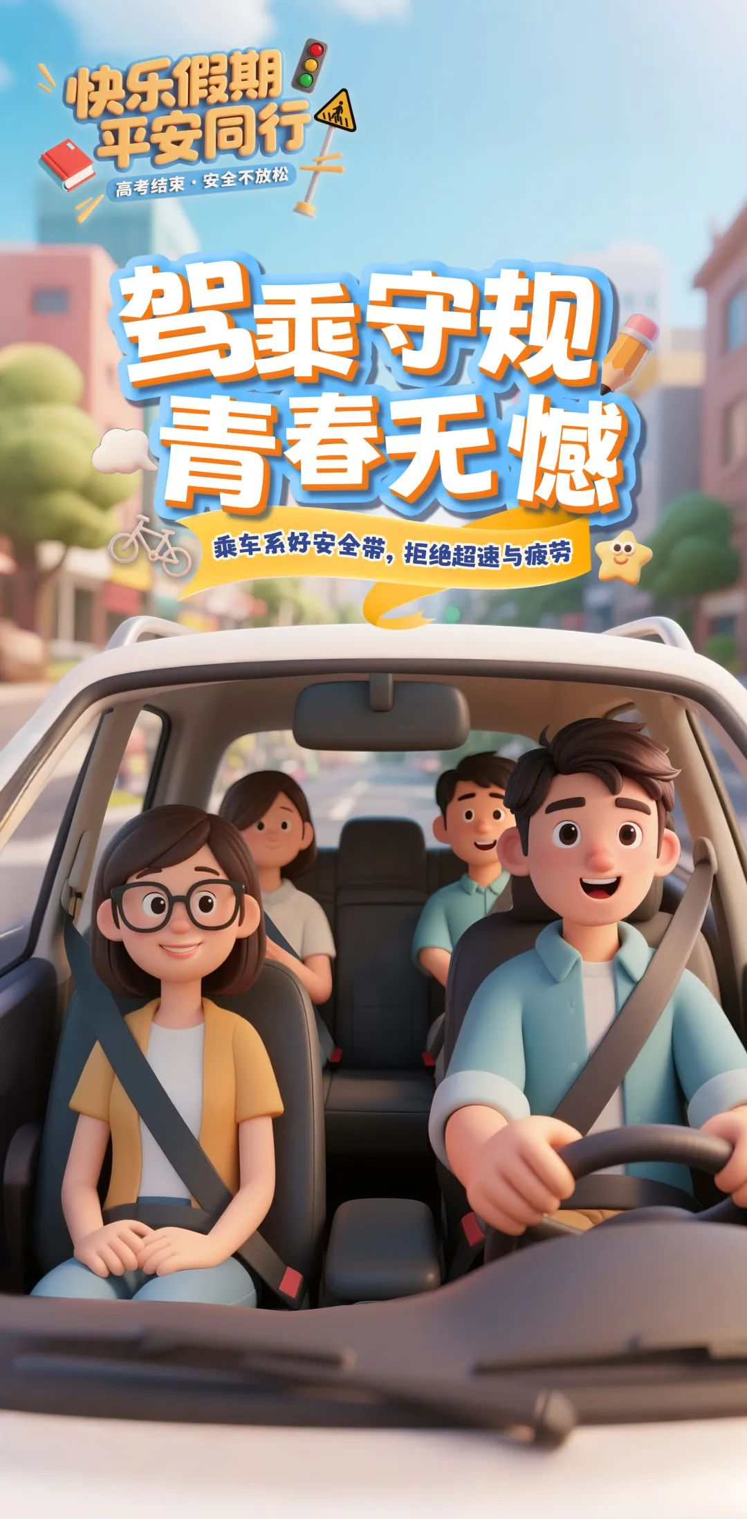 假期间,部分学生会和家人、朋友一起外出旅行,请选择到客运站点乘坐正规客运班车,拒绝乘坐非法营运的“黑客车”,坚决抵制超员车辆;牢记安全带是生命带,全车都系才安全。同时,若是自驾出游,要有合法驾驶证,勿超速行驶,拒绝疲劳驾驶、牢记“逢三进一”原则,勿让风险有机可乘。