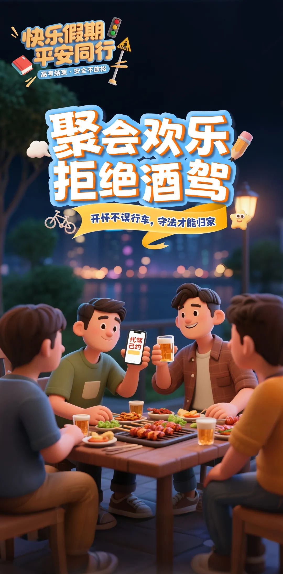 高考结束,同学们聚餐聚会活动增多,喝酒的可能性也会大大增加,有的同学心存侥幸,酒后骑乘电动车、摩托车甚至驾驶小汽车!酒后驾驶属于严重违法行为,存在极其严重的交通安全隐患,严重威胁自身和他人生命安全;醉酒驾驶还会涉嫌危险驾驶罪,万一发生事故还可能构成交通肇事罪。