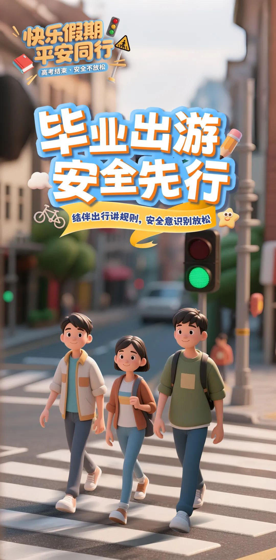 考后与同学结伴出游,过马路时要遵守信号灯,牢记“一停二看三通过”,做到不闯红灯、不逆行、不翻护栏、不随意横过马路、不在道路上嬉戏打闹。切勿边行走边玩手机,也不要戴着耳机听音乐,避免在面临险境时,因听不到车辆鸣笛等提醒而发生事故。