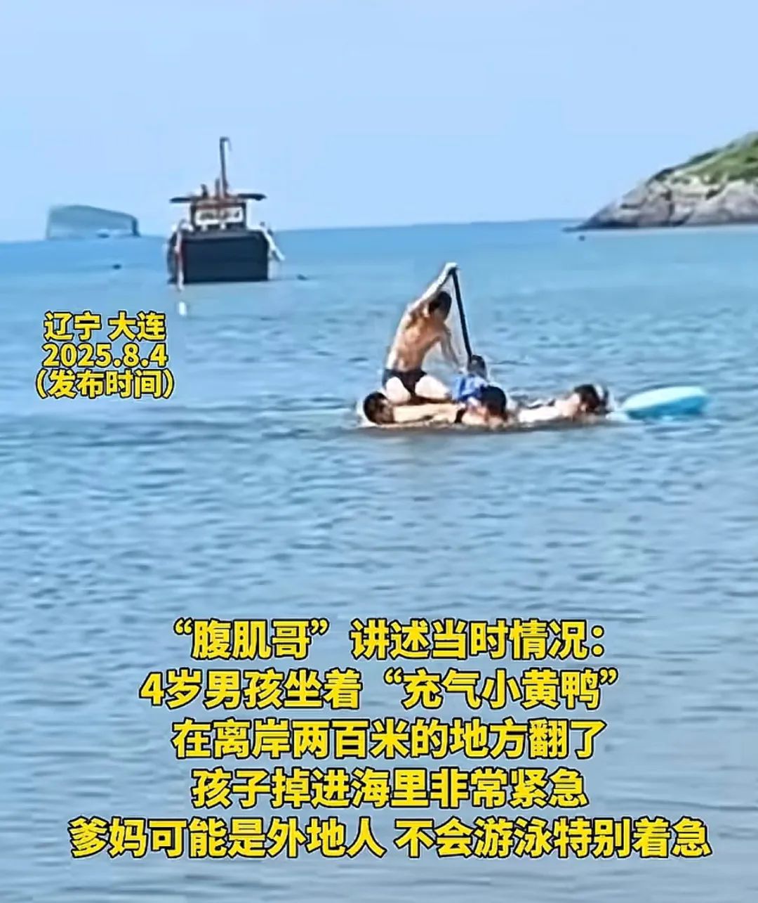 近日,在大连大黑石海滨浴场,海浪翻涌间,一个小小的身影在离岸200米处挣扎,一名4岁男孩坐着“充气小黄鸭”翻进了海里。岸边人群惊呼的瞬间,一道健硕的身影“咚”地跳进水中,如离弦之箭般冲了过去。他跪在晃动的桨板上,双腿稳住重心,奋力划水,阳光洒在紧绷的肌肉上,溅起的水花挡不住那双紧盯目标的坚定眼睛。