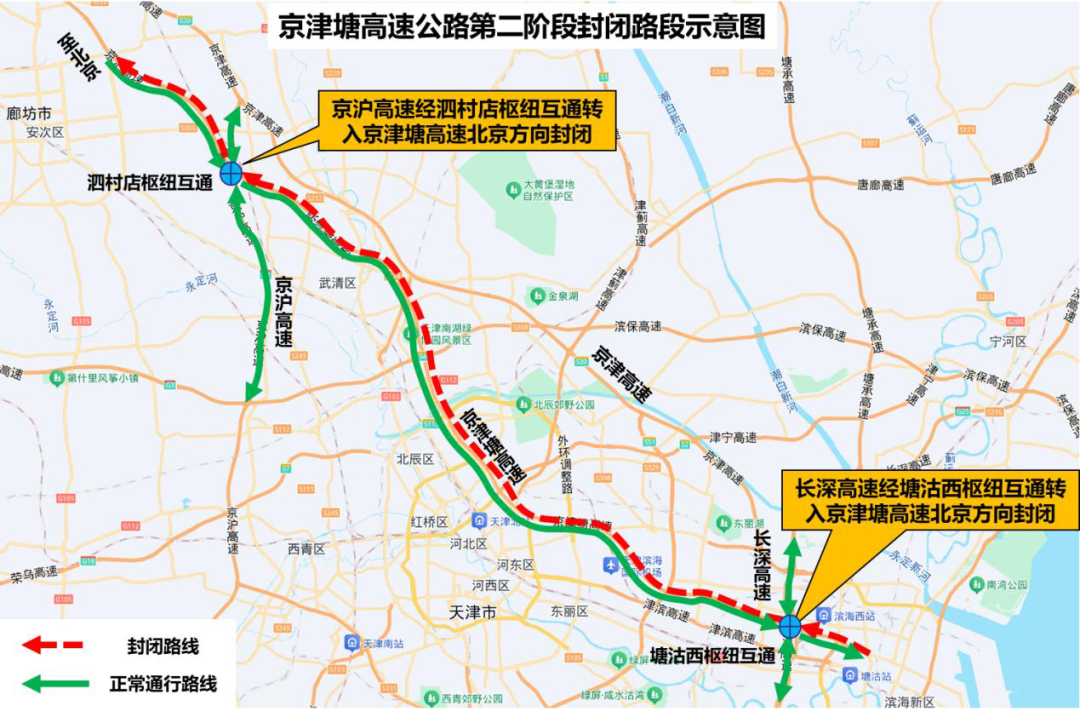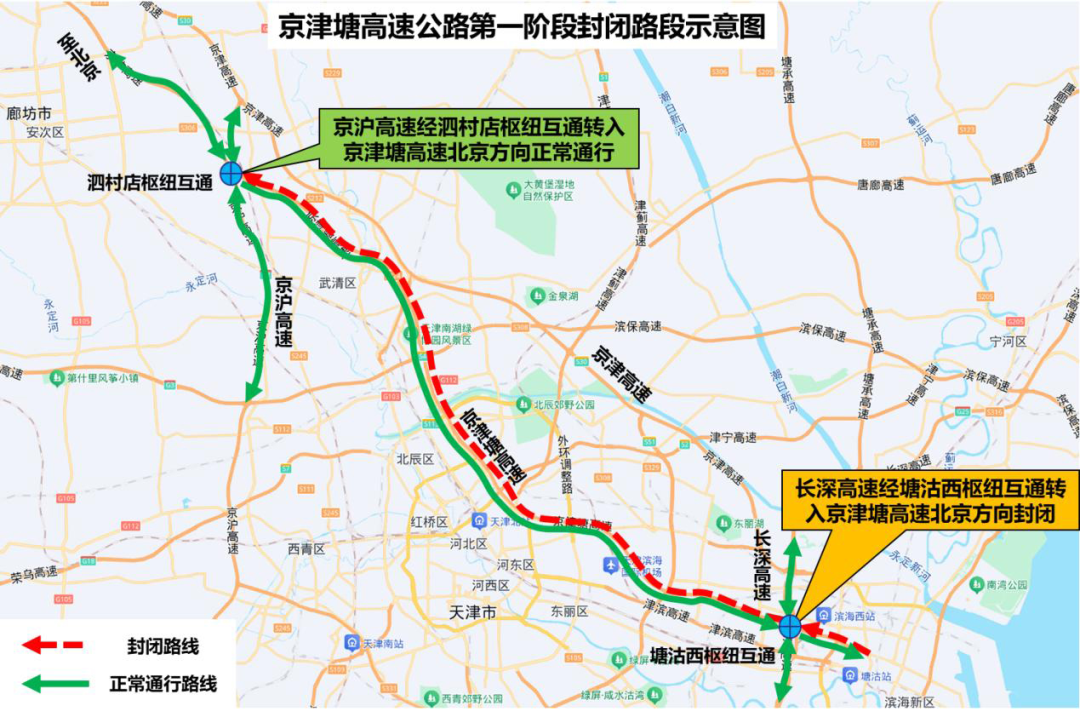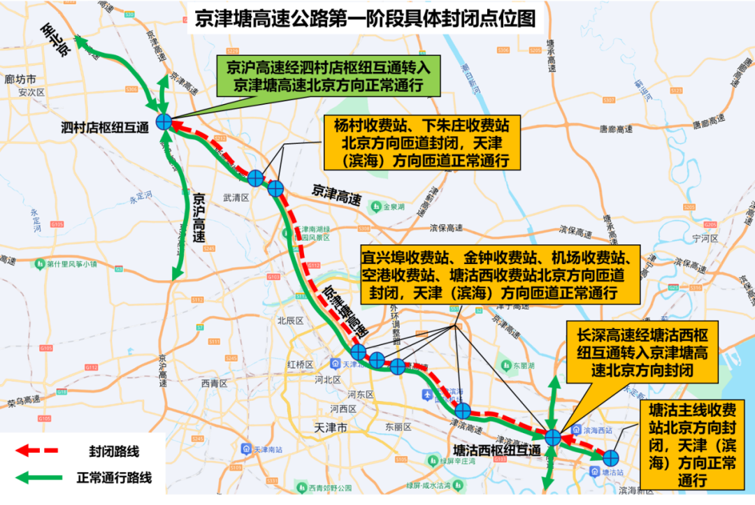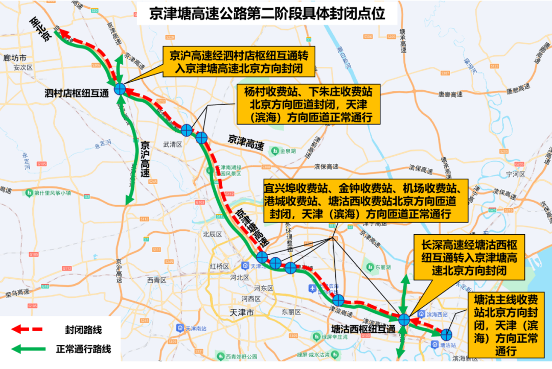 施工期间,沿线的塘沽主线收费站、宜兴埠收费站、金钟收费站、机场收费站、空港收费站、塘沽西收费站、下朱庄收费站、杨村收费站北京方向匝道以及长深高速经塘沽西枢纽互通转入京津塘高速北京方向封闭,天津(滨海)方向、京沪高速经泗村店枢纽互通转入京津塘高速北京方向可正常通行。