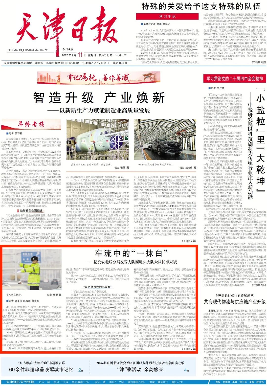津门冬日,寒风中有“一抹白”,挺立如松。车流人海间,他是会呼吸的信号灯,是保平安的指向标。
