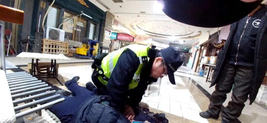 老人晕倒,失去意识,呼吸微弱。民警查看情况后,迅速上前跪在地面上,对老人进行心肺复苏。一下、两下、三下……动作标准而有力,围观的群众屏住呼吸,默默祈祷。