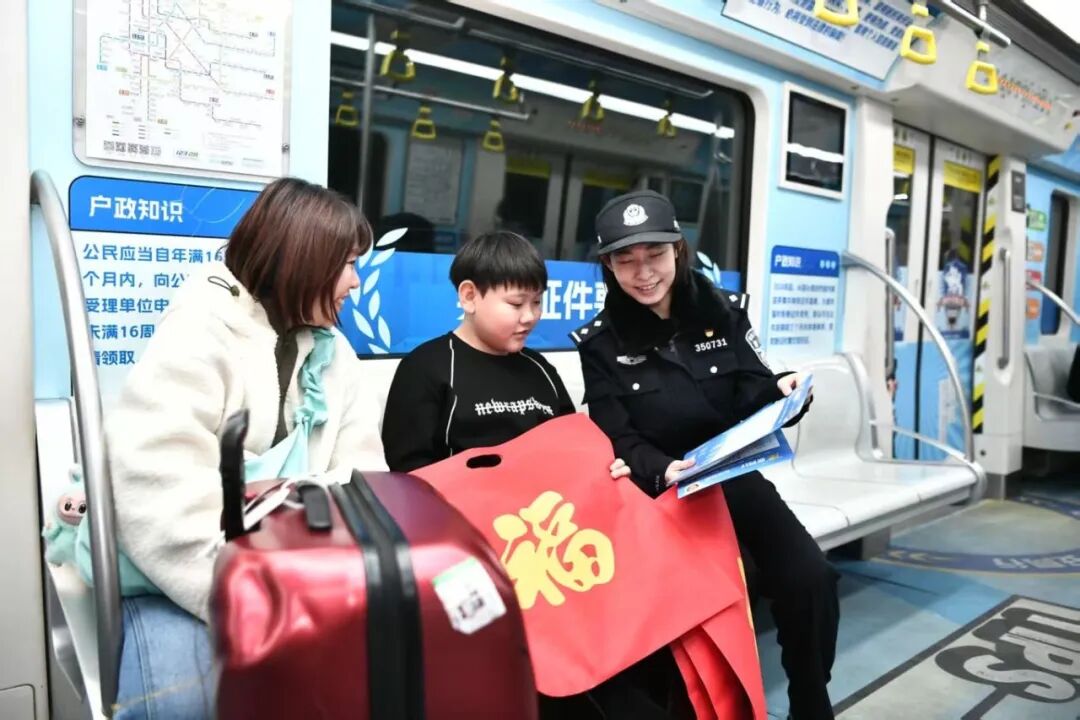 春运首日,地铁站已是一片繁忙景象。拖着行李箱的旅客、背着年货的归家人……人潮涌动中,一抹抹“警察蓝”格外醒目。