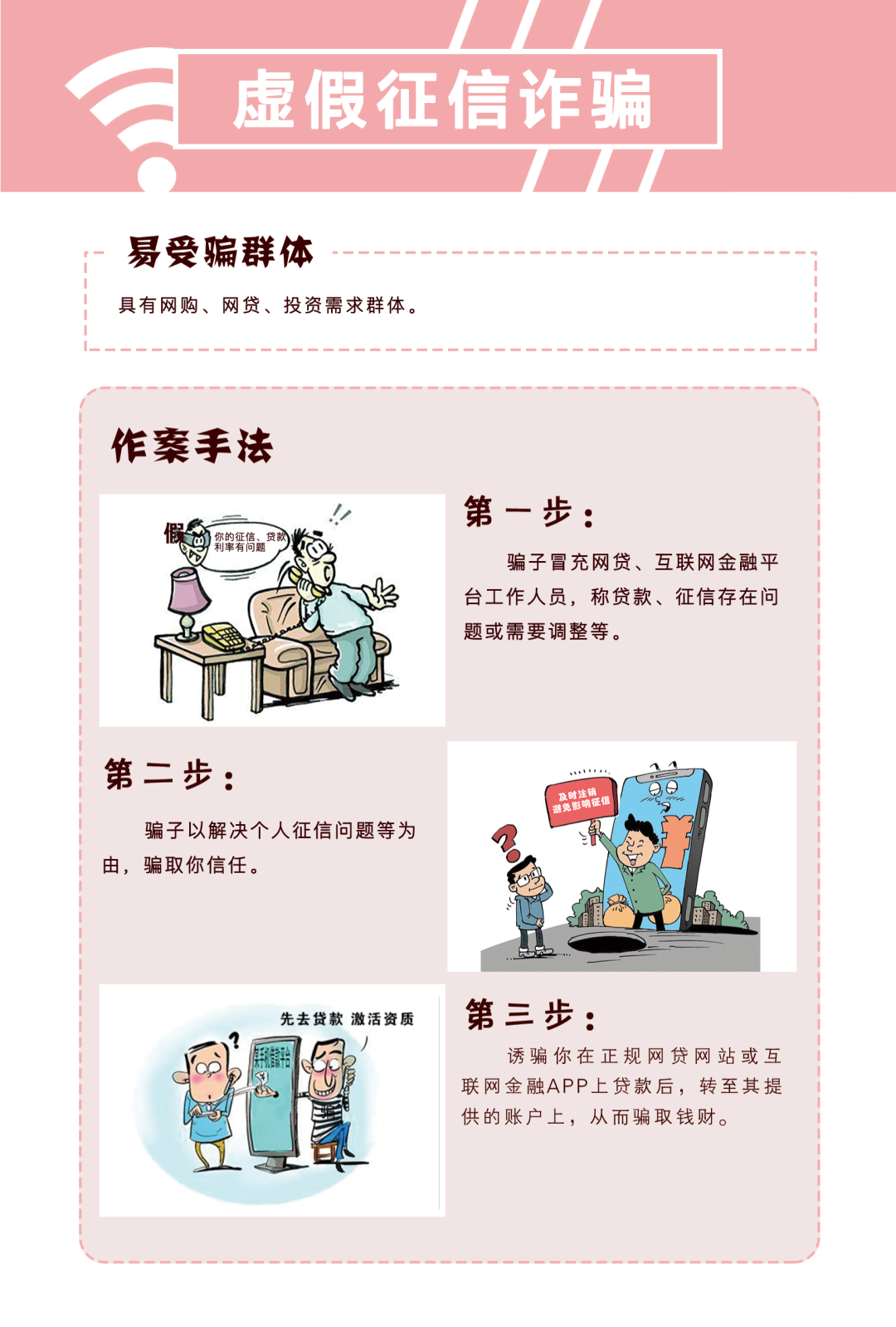 本周刷单返利、虚假购物、虚假征信3类电诈高发,为避免上当受骗,应谨记“心莫贪,擦亮眼,绷根弦,防诈骗”。
