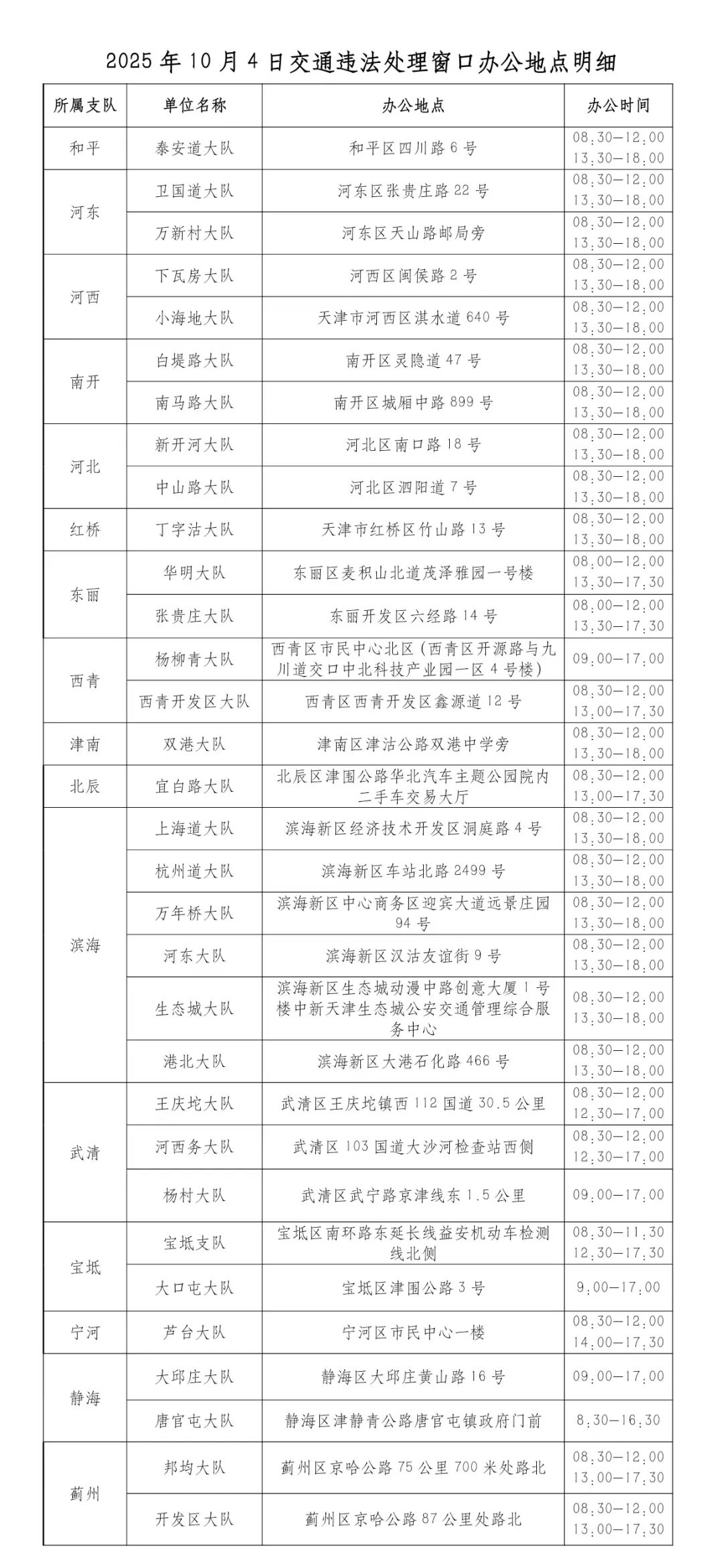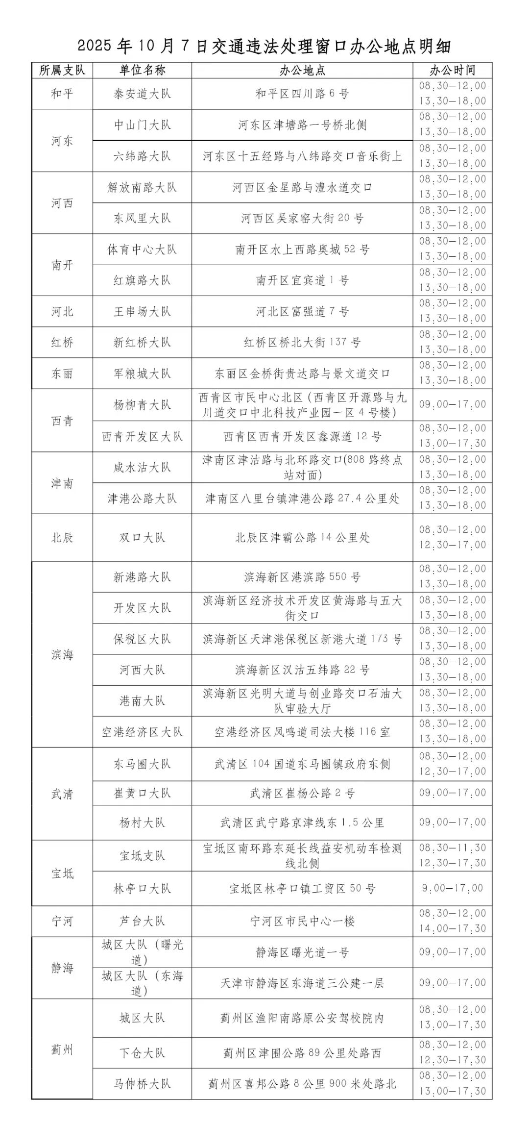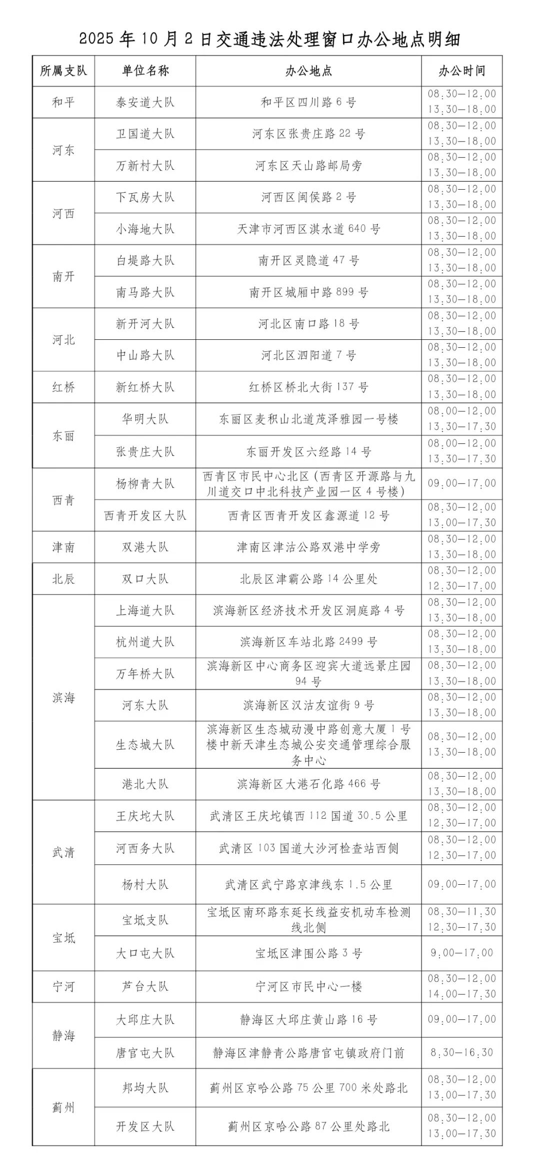此外,我市违法处理窗口开放情况如下,广大机动车驾驶人可根据自身实际需求前往办理非现场违法处理业务。