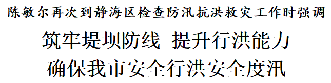 当前,大清河洪水已经进入第六埠,东淀蓄滞洪区水位持续上涨,我市行洪压力仍在加大,南线防汛抗洪形势严峻。8月7日,市委书记陈敏尔再次来到静海区,检查防汛抗洪救灾工作。他强调,要深入贯彻落实习近平总书记关于防汛救灾的重要指示精神,认真落实党中央、国务院决策部署,坚持底线思维,立足极端情况,抓紧查漏补缺,持续做好防汛工程除险加固,筑牢堤坝防线,切实提升泄洪分洪能力,确保我市安全行洪、安全度汛。